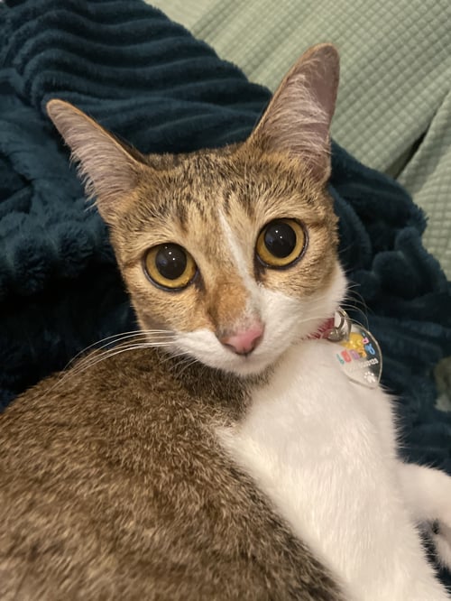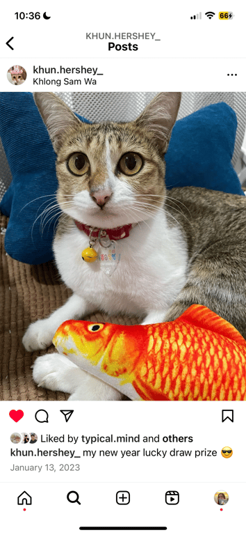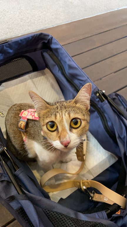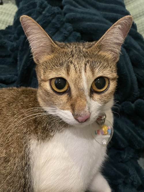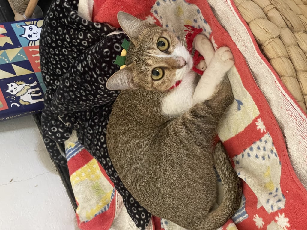 รอยตำหนิ: เขี้ยวซ้ายล่างบิ่น หางสั้น ถุงเท้าขาว ขาหน้าขาวถึงอก ขีดขาวที่ด้านบนจมูกข้างซ้ายชอบสะบัดข้าวเวลากิน ชามน้ำต้องห่างจากชามข้าว