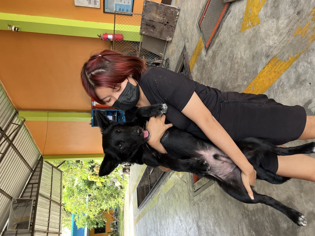 รอยตำหนิ: คอและอกมีแถบขาวเพศผู้ยังไม่ทำหมัน ปลอกคอสีชมพู มีแท็กgps สีดำ กด2ทีจะโทรมา