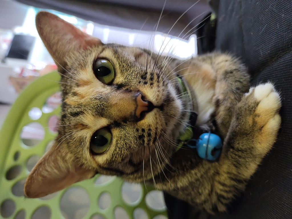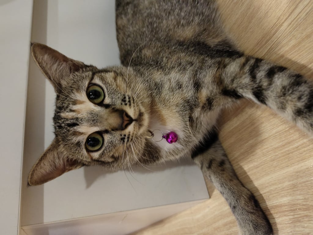 รอยตำหนิ: รูปร่างสมส่วน / ท่าทางเรียบร้อยปลอกคอแบบเชือกปรับได้ สีเขียว / มีป้ายชื่อ+เบอร์ / มีกระดิ่ง