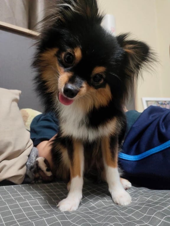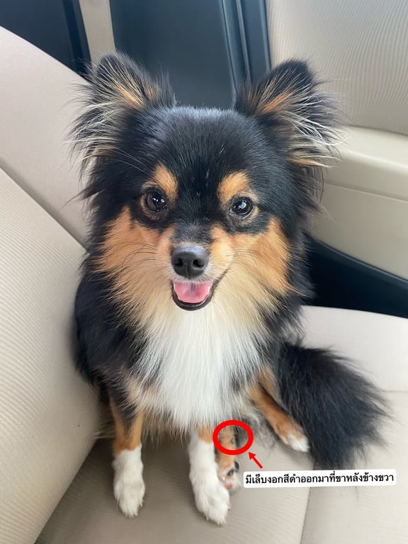 รอยตำหนิ: ขนตัวสีดำแผงคอสีขาวมีขนสีขาวที่ขาเหมือนใส่ถุงเท้า ขาขวาด้านหลังมีเล็บงอกมากเป็นติ่งนิดนึงน้องไม่ดุติดคนมากขี้เล่นชอบเล่น จะเห่าเสียงแหลมมากและก็ขี้อิจฉา เวลาเล่นกับตัวอื่นจะขึ้นมานั่งตักทันทีแล้วจะชอบขู่ใส่ไม่ให้เล่นกับตัวอื่นให้เล่นกับน้องแค่ตัวเดียว