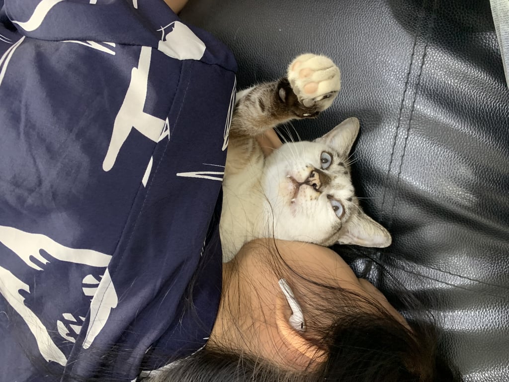 รอยตำหนิ: หางกวัก ใต้คางมีรอยแผล ลิ้นแหว่ง ตาสีเทาน้องชอบนอน ไม่ดุ เข้าหาคน