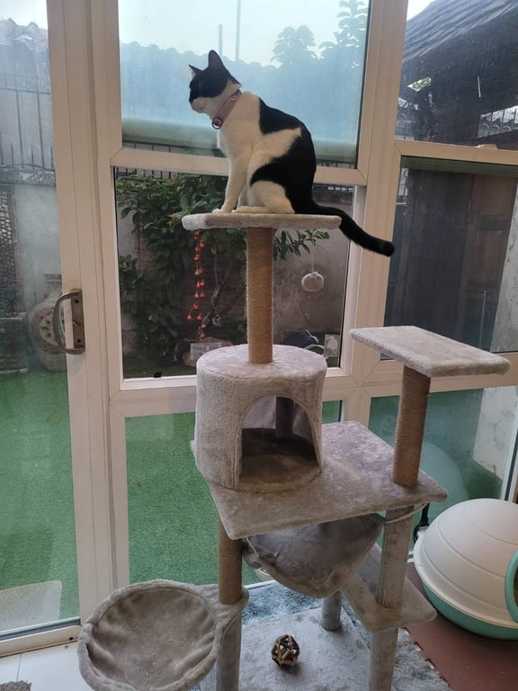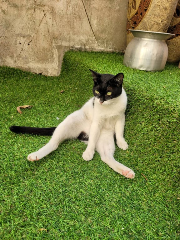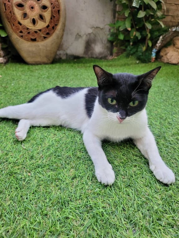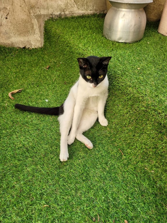 รอยตำหนิ: สีครึ่งบนเป็นดำข้างล่างเป็นขาวที่หน้าจะดูเหมือนว่าเป็นแมวใส่หน้ากาก หรือเเมส ใส่ปลอกคอสีชมพู มีป้ายชื่อว่า ม้าลาย และเบอร์โทรติดต่อที่ปลอกคอขี้ตกใจ ชอบมองดูะไรอยู่นิ่งๆ ถ้ารียกเหมียวๆ มันก็จะชอบเหมียวตอบกลับมาเรื่อยๆ