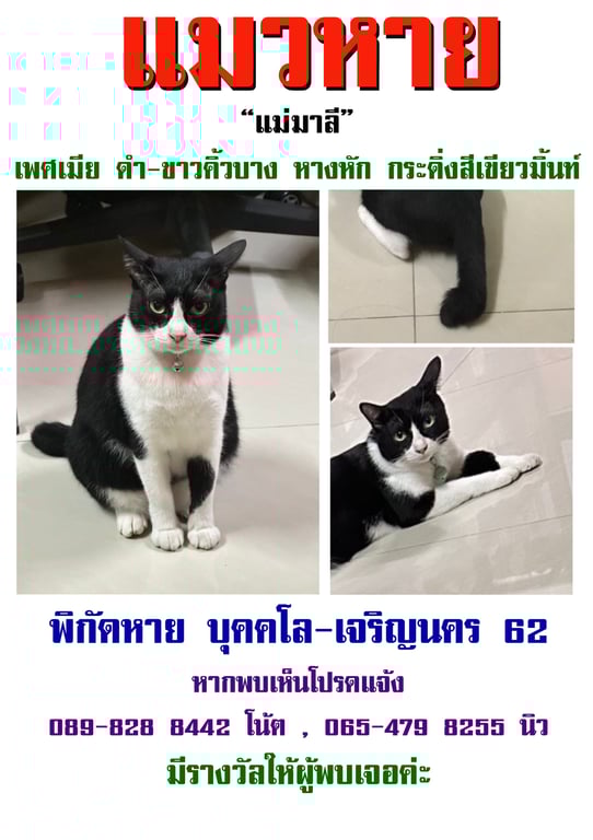 รอยตำหนิ: หางหัก กระดิ่งสีเขียว คิ้วบางน่ารัก ไม่กลัวคน