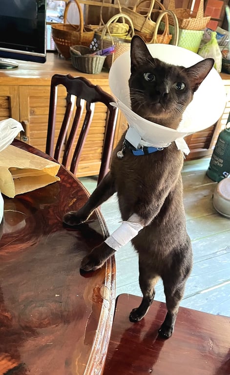 รอยตำหนิ: น้องมีแผลขาหน้าซ้าย ใส่คอลล่าที่คอน้องแมว ชื่อ "โคล่า" ขนสีน้ำตาลเข้ม สวมปลอกคอสีน้ำเงินมีกระดิ่ง ที่ปลอกคอสลักชื่อและเบอร์โทรเอาไว้ น้องมีแผลที่ขาหน้าซ้าย ใส่คอลล่าไว้ที่คอและต้องกินยาด้วยค่ะ น้องจะตื่นคนนิดนึง แต่พอคุ้นเคยก็จับได้ค่ะ น้องชอบแมวเลียกับอาหารเปียกมากค่ะ แค่เคาะซองแมวเลียหรือซองอาหารเปียกน้องจะรีบมาเลยค่ะ
