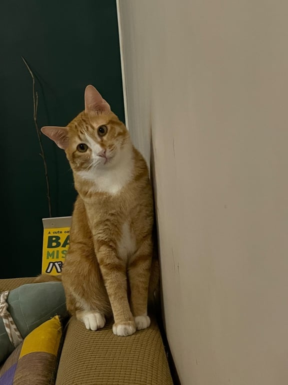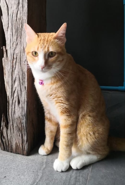 รอยตำหนิ: สีส้ม แผงอกสีขาว ใส่ถุงเท้า 4 ขา ปลายหางงอซนมาก มีความสนใจในทุกสิ่งที่เคลื่อนไหวได้ ชอบเล่น คุยเก่ง ชอบให้เกาโคนหาง