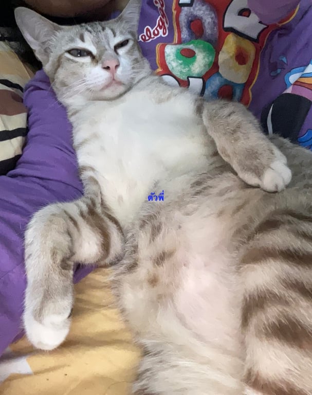 รอยตำหนิ: ตัวใหญ่ น้ำหนักประมาณ 5+ กิโล มีรอยขนแหว่งที่คอด้านหนึ่งขี้อ้อน กินเก่ง ชอบร้องเรียก