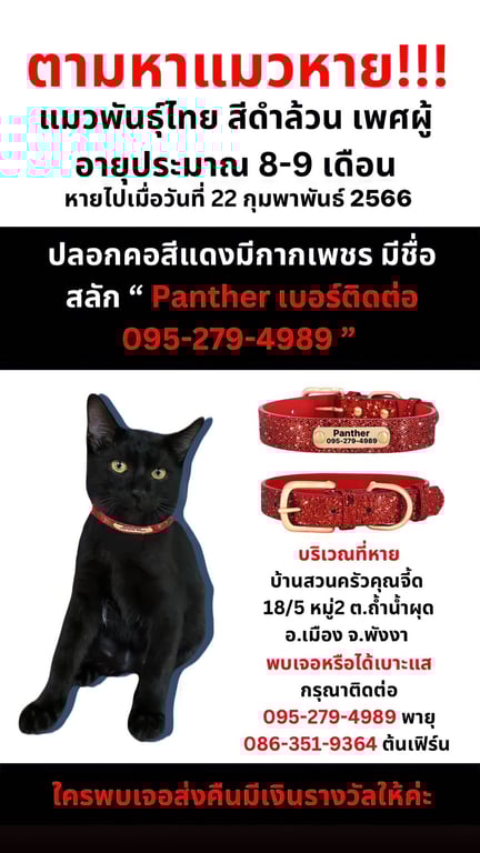 รอยตำหนิ: มีขนสีขาวบริเวณหน้าอกนิดนึงค่ะใส่ปลอกคอสีแดงมีกากเพชร สลักชื่อไว้ว่า panther และมีเบอร์ติดต่อ 095-279-4989