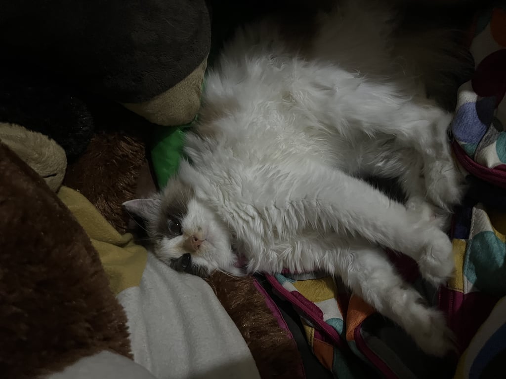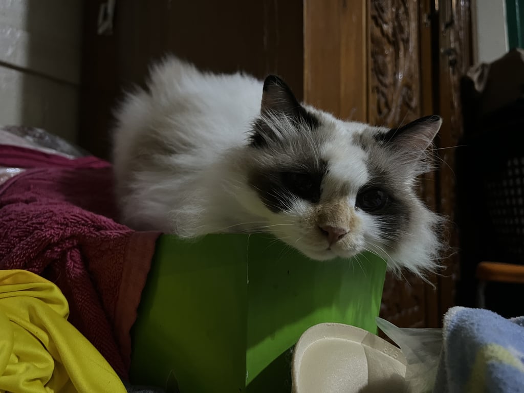 รอยตำหนิ: มีแต้มจุดน้ำตาลที่ปากซ้ายเหมือนไฝน้องเหมือนแร็กคูน ชอบเข้าหาคน เข้าหาหมาแต่ไม่ค่อยเข้าหาแมวด้วยกัน ชอบชวนคนเล่น