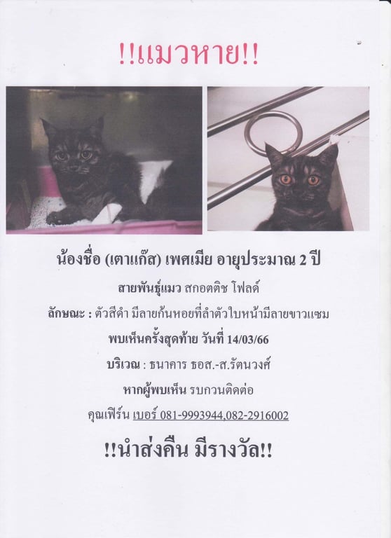 รอยตำหนิ: น้ำหนักประมาณ 3กิโลกรัม ไม่มีปลอกคอค่อนข้างขี้กลัว ตื่นตกใจคนง่าย ไม่ค่อยส่งเสียงร้อง