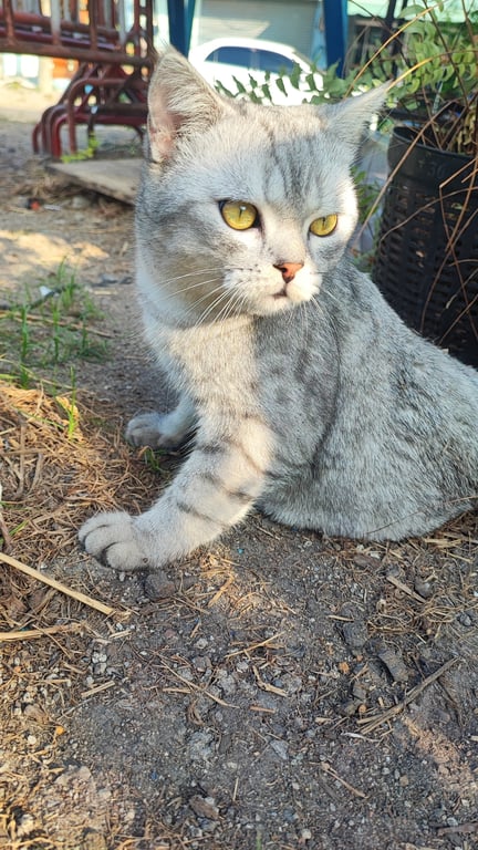 รอยตำหนิ: ขนสีดำใต้เท้า, ลายเส้นสีเทาจาง (ไม่ดำเหมือนพันธุ์อเมริกันช็อตแฮร์)ขี้อ้อน ยอมให้คนลูบหัวไปทั่ว ท่าทางการเดินตะคุ้มเหมือนสิงโต ตัวใหญ่คุ้มซอย มีหมาเป็นสมุน