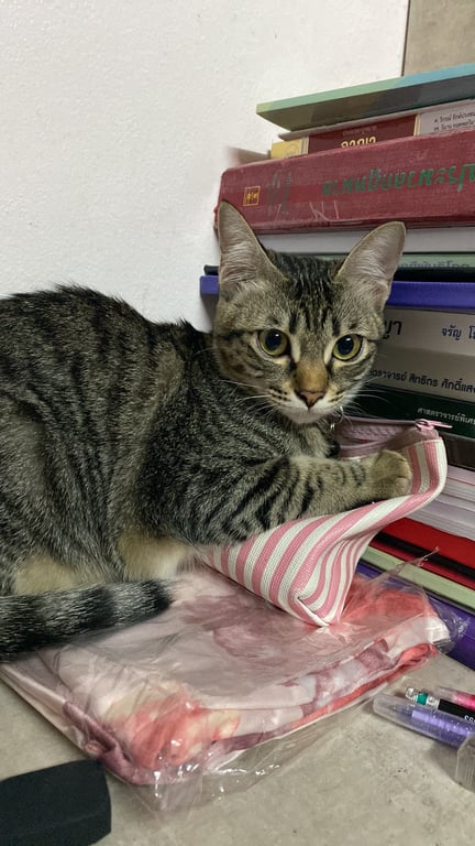 รอยตำหนิ: มีปลอกคอสีดำมีกระพรวนที่ปลอกคอ พุงย้อยเหมือนมีถุงใต้พุงชอบเสียงกระดิ่งมาก