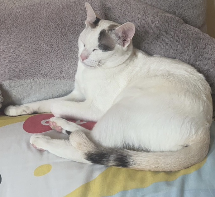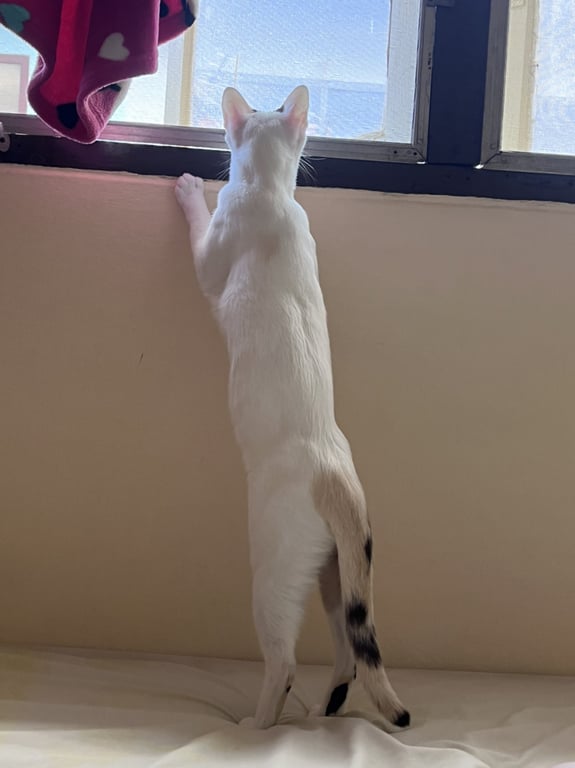 สี: ตัวขาวขาข้างนึงน้ำตาลอ่อน หางสีทองกับดำปลายหางเป็น