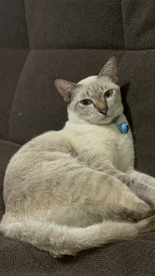 รอยตำหนิ: น้ำหนัก 4 กิโล ลายสลิดสีขาวแซมเทาน้ำตาลใส่ปลอกคอนิรภัยสีเขียวน้ำทะเล มีป้ายชื่อวงกลมสีเงินเล็กๆขนาดเท่าเหรียญ 50 สต. เขียนชื่อและเบอร์โทรเจ้าของ นิสัยขี้กลัว ขี้ตกใจ ปกติชอบเล่นภายในบริเวณรั้วบ้าน ส่วนกลางคืนก็จะเข้ามานอนในบ้าน