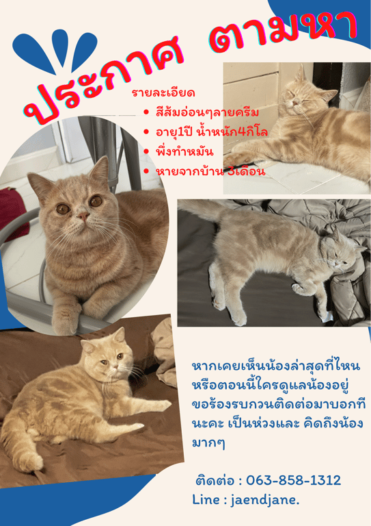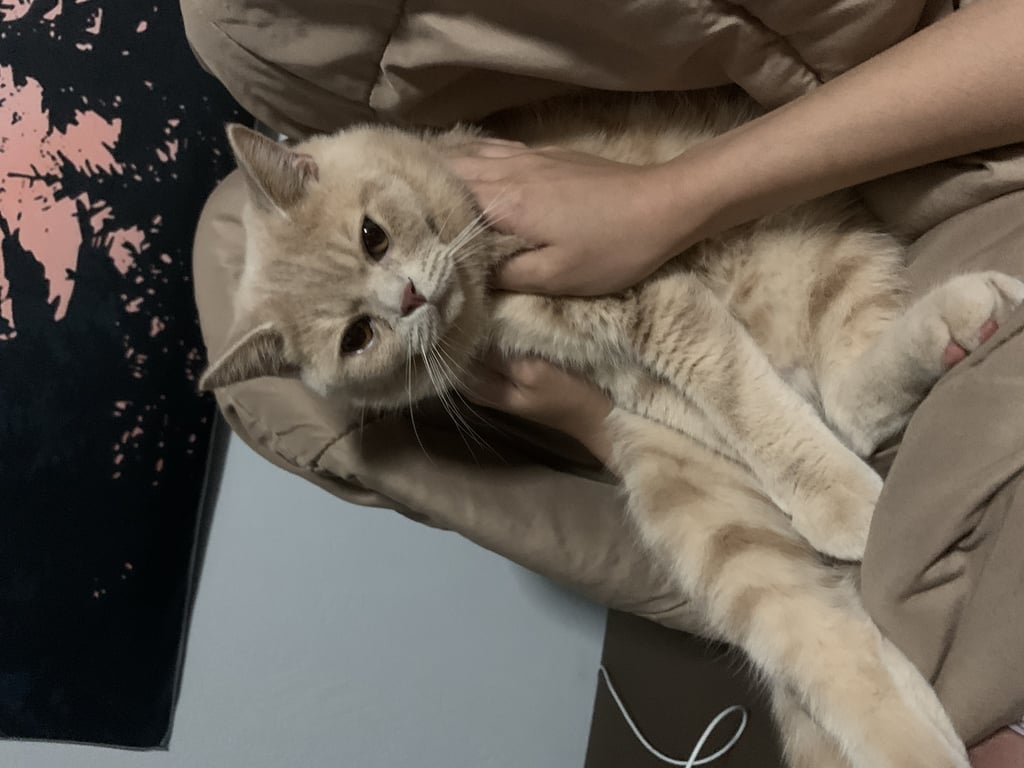 รอยตำหนิ: ตรงไข่ มีสีดำๆคล้ายปาน มีรอยเเผลที่ซอกเท้าหลังไม่ดื้อ ค่อนข้างเงียบ อ้อนคนแล้วแต่วัน ไม่ค่อยชอบให้อุ้มหรือจับไว้กับที่นานๆ กินบ่อย