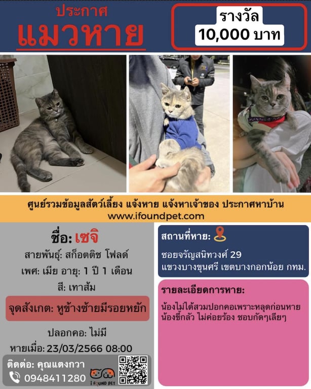 รอยตำหนิ: หูข้างซ้ายมีรอยหยักน้องไม่ได้สวมปอกคอเพราะหลุดก่อนหาย น้องขี้กลัว ไม่ค่อยร้อง ชอบกัดๆเลียๆ