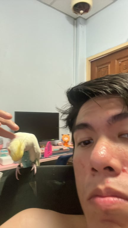 รอยตำหนิ: ที่ขามีป้ายชื่อและเบอร์โทร ใส่ผ้ากันเปื่อนสีเขียวแบบในรูป
