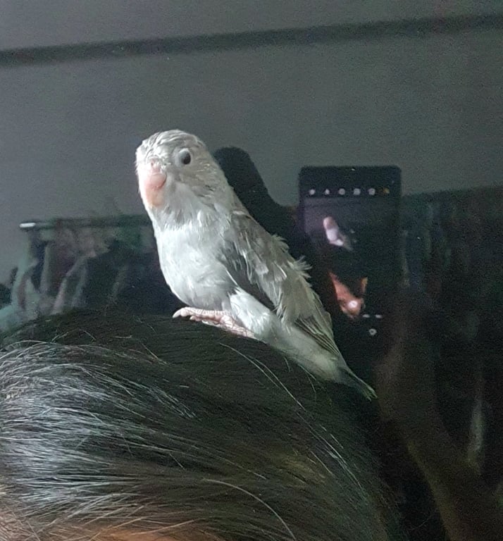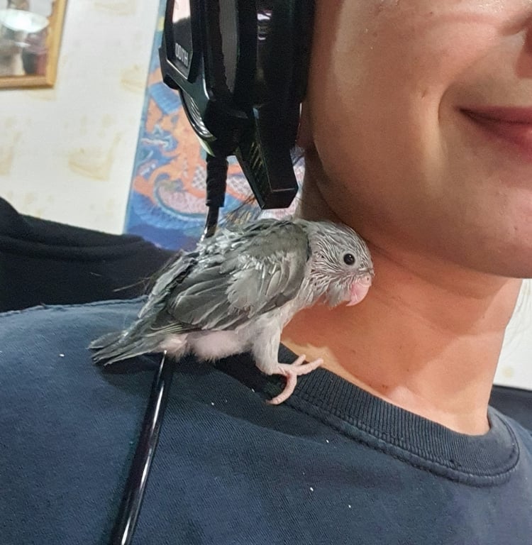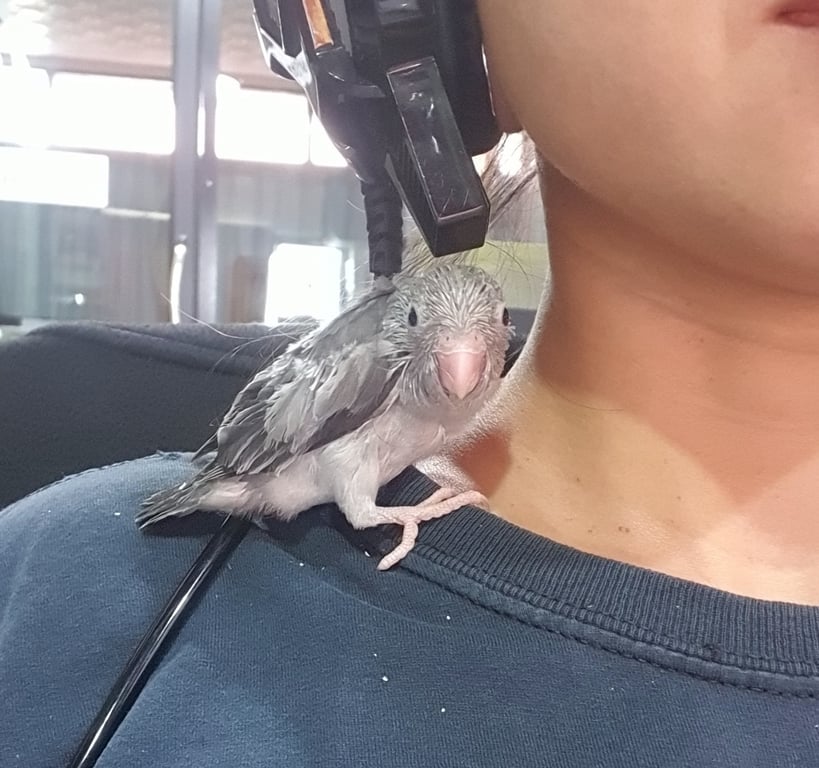 รอยตำหนิ: ไม่มีปลอกขา ขนขึ้นเต็มตัวแล้วสีเทาขนขึ้นแล้วอายุ 2เดือนกว่า น่าจะบินเก่งแล้วค่ะ ขี้อ้อน ชอบมุดคอเสื้อ บินขึ้นหัว