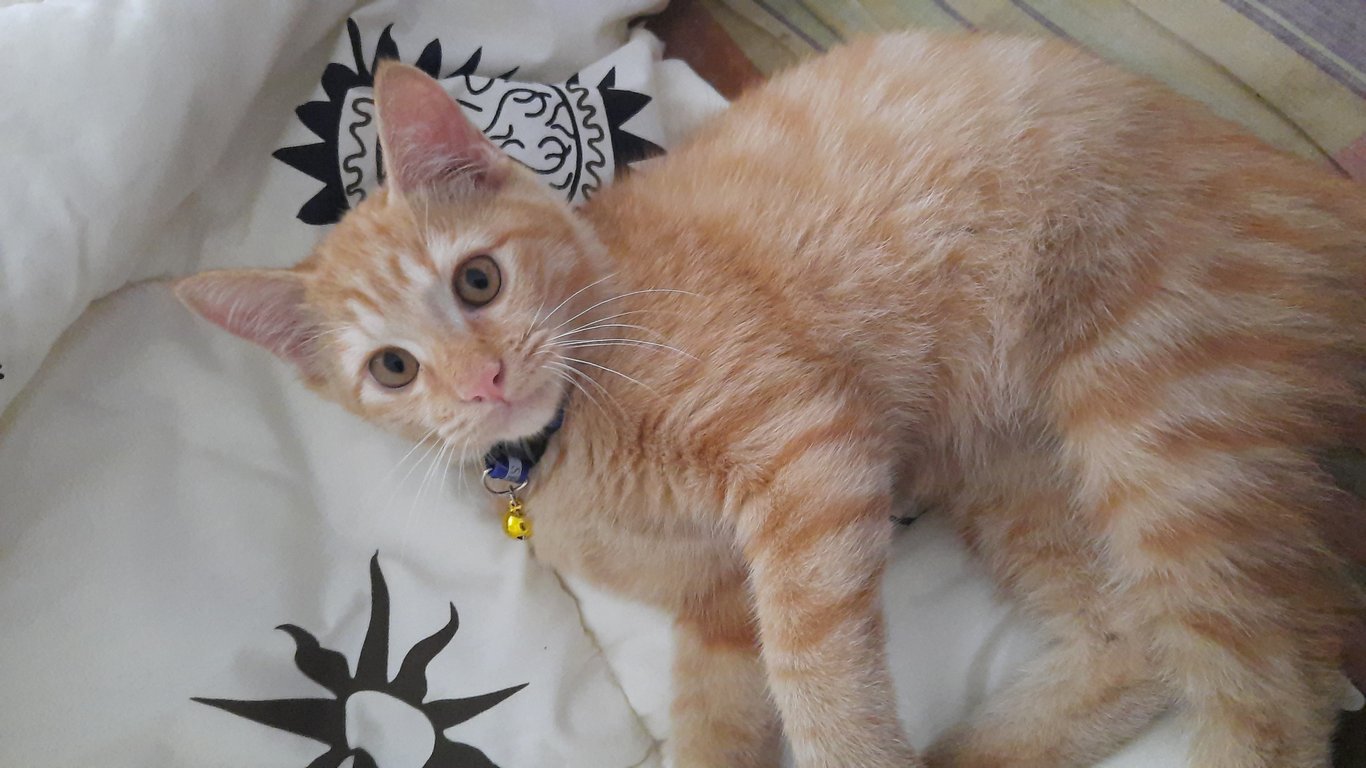 รอยตำหนิ: อุ้งเท้าใหญ่ มีสีดำตรงปลายหูด้านซ้าย ปลายหางจะสีส้มสลับขาว ใส่ปลอกคอสีเขียวมีหัวแมวสีเขียวเป็นมิตรชอบอ้อน เวลาใครชวนขึ้นรถน้องก็ขึ้น ไปกับคนง่าย ซน