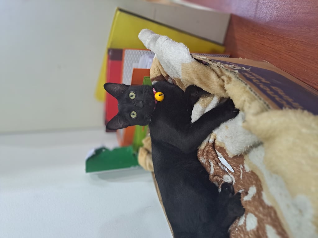 รอยตำหนิ: สีดำทั้งตัว หางกวัก มีปอกคอ กระดิ่งสีเหลือง ขาหลังขวาเจ็บขี้กลัว ใจดีไม่กัด ไม่ออกเล็บ หางกวัก สีดำสนิท ปลอกคอกระดิ่งสีเหลือง ขาหลัวขวาเจ็บ