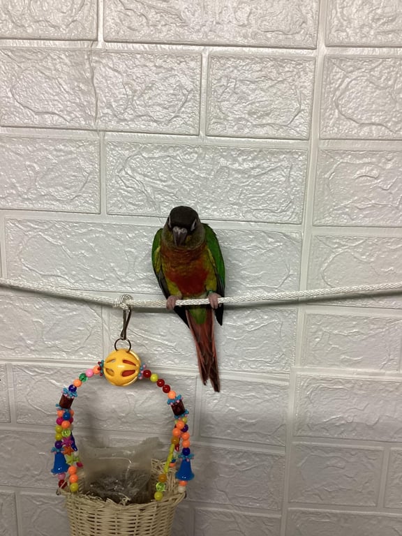 สี: หัวสีดำ ปีสองข้างสีเขียวเข้ม ตรงอกสีแดง ขามีสีเขีย