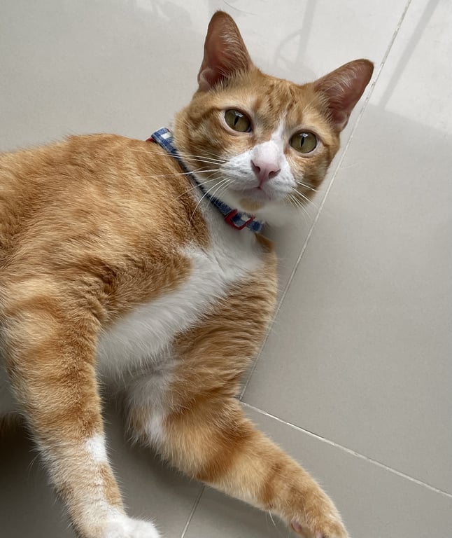 รอยตำหนิ: มีลายสีขาวที่หน้าและเท้า ปลอกคอสีน้ำเงินขี้กลัว ขี้ตกใจ กลัวคน กลัวรถ วิ่งเร็ว ไม่ชอบให้อุ้ม