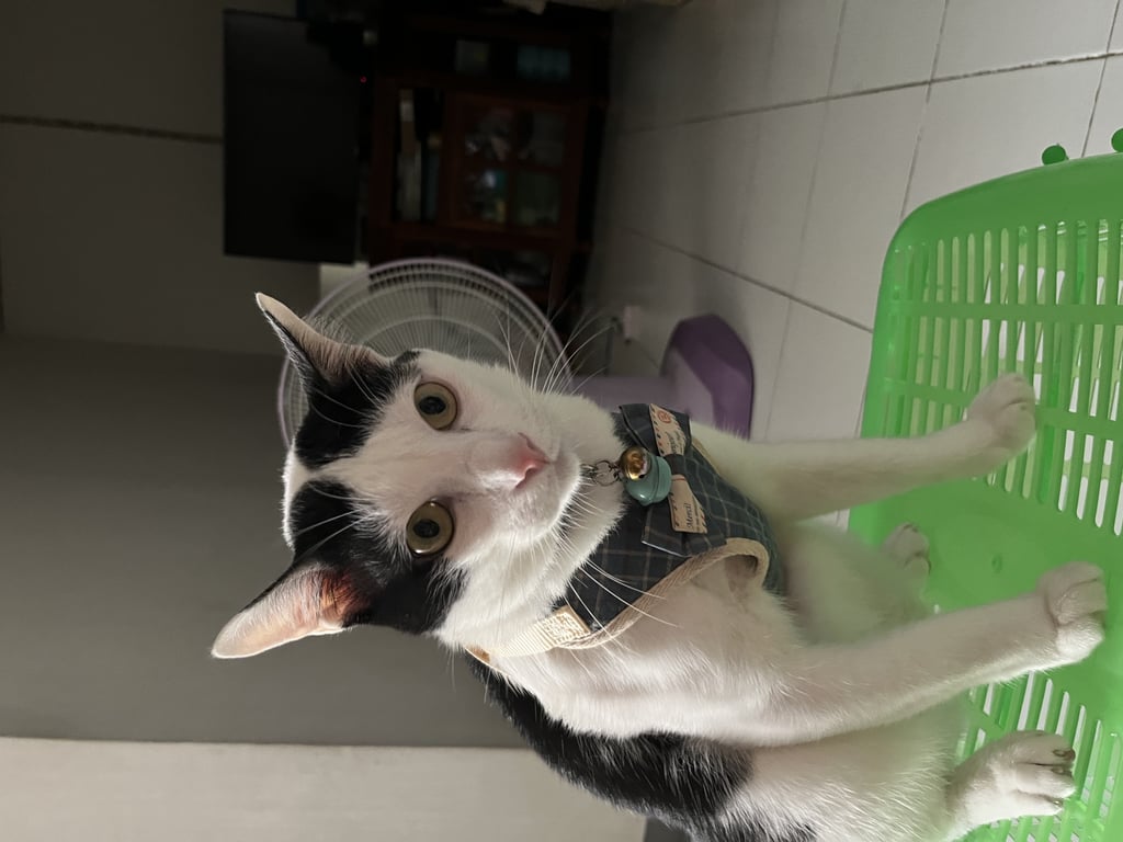 รอยตำหนิ: มีแต้มสีดำที่ขาขวาทั้งหน้าและหลัง น้ำหนัก 6 กก.กลัวคนแปลกหน้ามากๆ