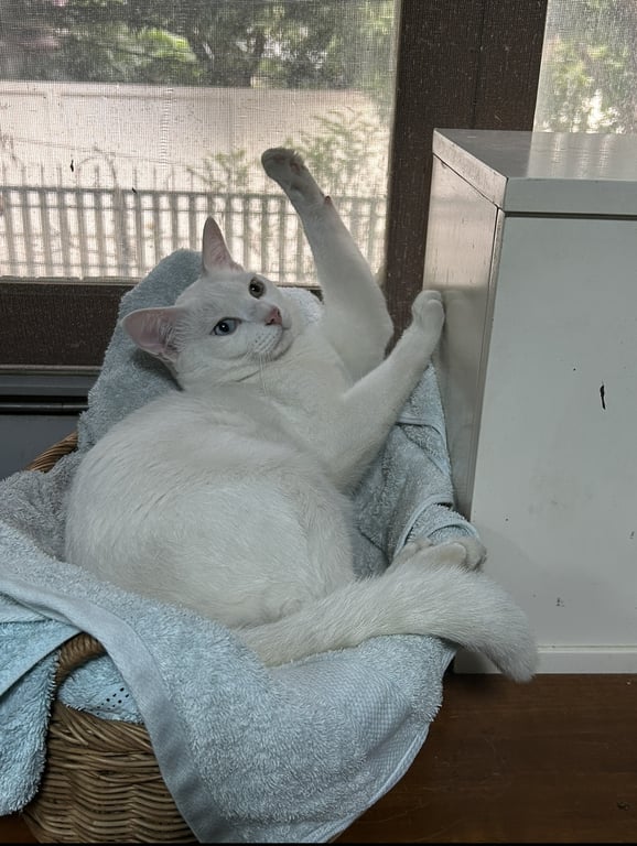 รอยตำหนิ: หสงยาวตรง ตาสองสี ปลอกคอสีน้ำเงิน หนัก 5 โลแมวเลี้ยงในบ้าน ขี้กลัว