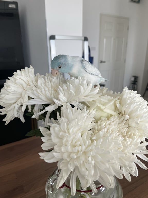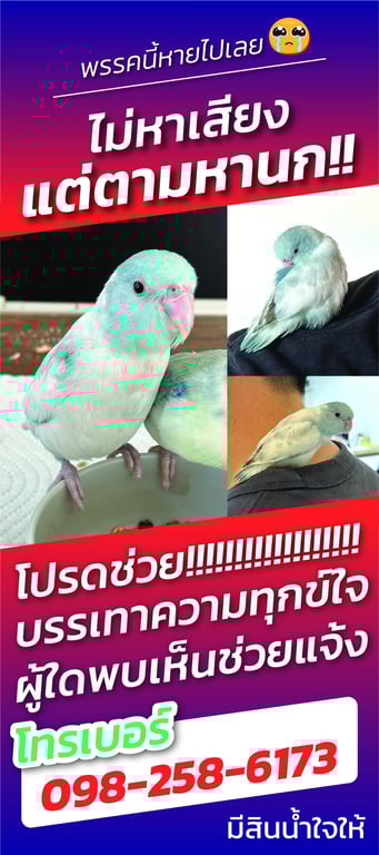 รอยตำหนิ: มีขีดมาร์คที่หางนกแก้วฟอพัส สีขาว หน้าสีฟ้า ไม่มีห่วงขา ติดคนมาก น้องนิสัยร่างเริง ขี้วีนนิดหน่อย แต่น่ารักค่ะ