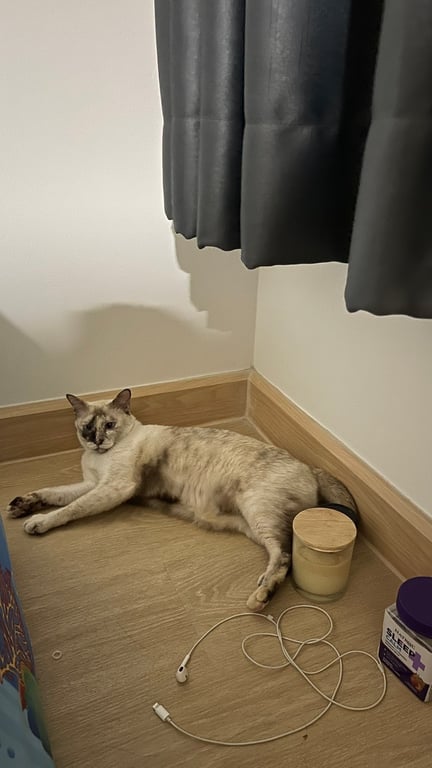 รอยตำหนิ: หน้าดำด้านขวา ตาสีฟ้าเทาๆ มองผ่านๆ คล้ายตาเหล่ หางมีลายแซมสีน้ำตาลไม่มีปลอกคอ ท้องห้อย มีหัวนมที่สังเกตใกล้ๆ จะเห็น