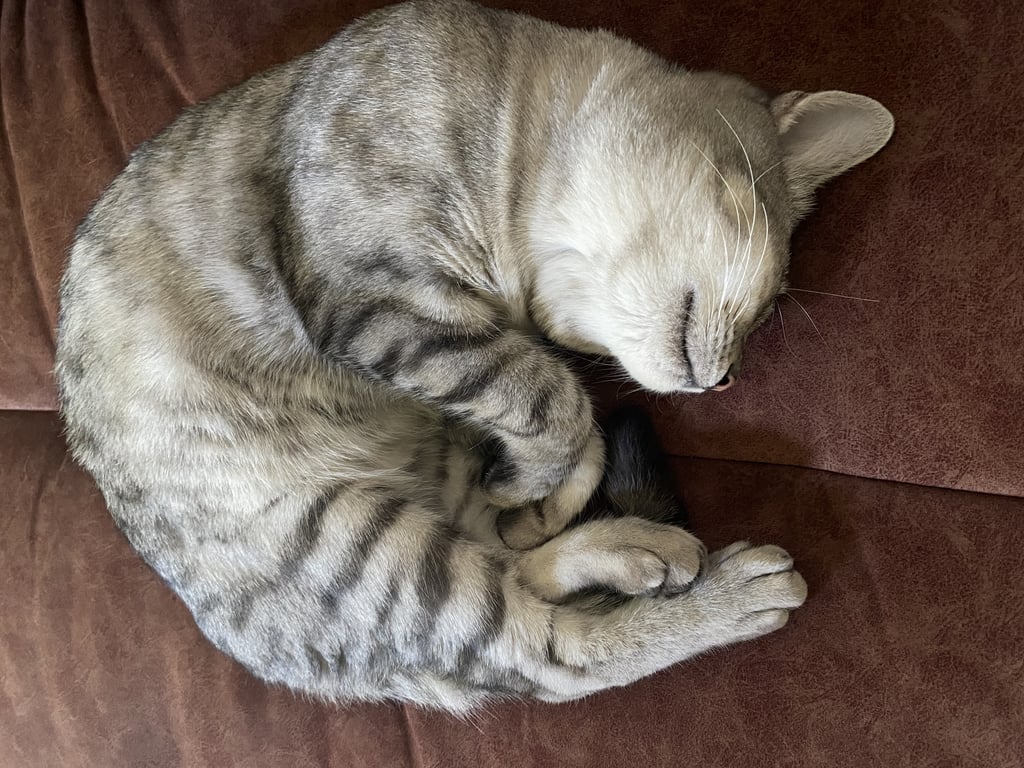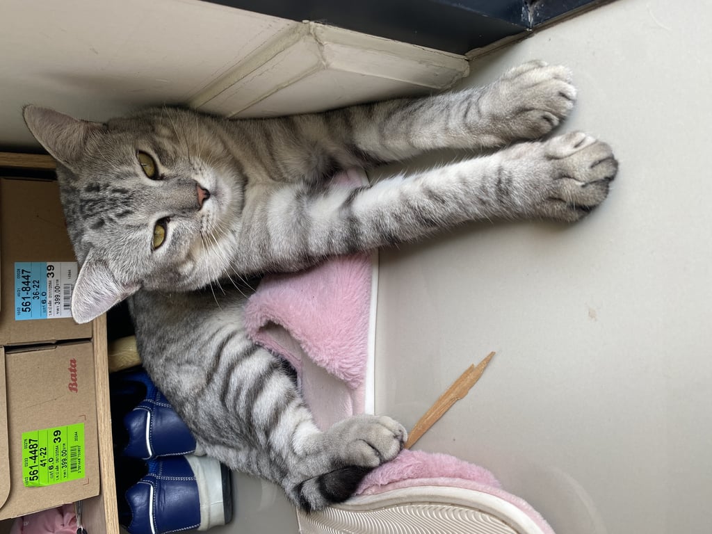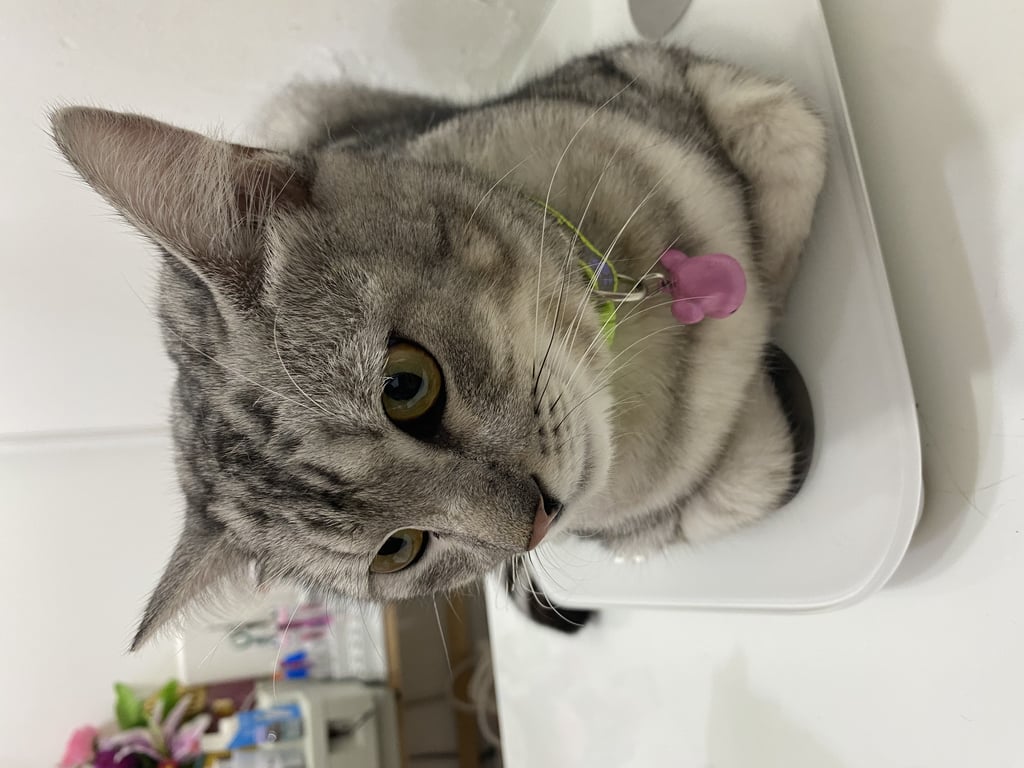 รอยตำหนิ: นน.4.7กก. ลายบนหน้าผากมาเส้นพาดเหมือนใส่คาดผม และเหนือขึ้นไปคล้ายเลข8เชื่อง เข้าคนค่อนข้างง่าย กลัวแมวอื่นๆแม้แต่แมวเด็กกว่า
