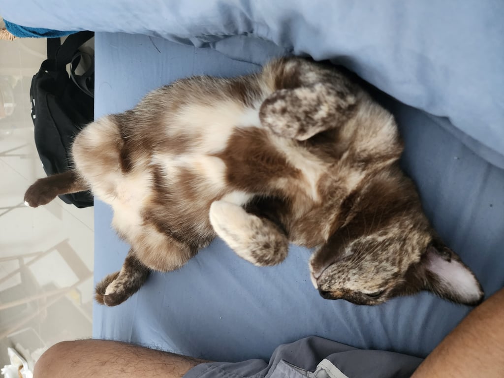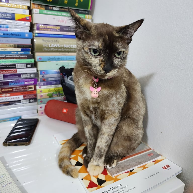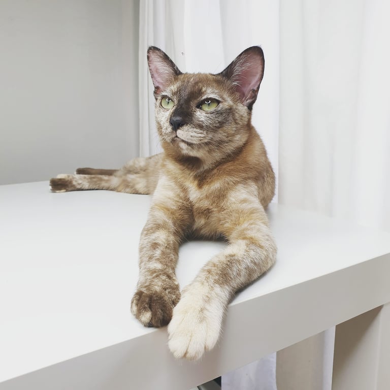 รอยตำหนิ: เท้าหน้าข้างซ้ายมีสีครีมสว่าง อีกสามเท้าเป็นสีน้ำตาลเข้มขี้กลัว ขี้ตกใจ (โดยเฉพาะเสียงฝน) ไม่สู้ใคร ไม่แย่งใครกินก่อน ชอบหาที่ซกตัวเวลากลัว