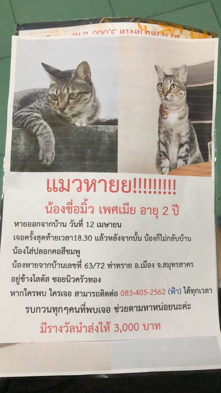 รอยตำหนิ: ปลอกคอสีชมพู น้ำหนักประมาณ4.7 โล ตากลมโต หน้ากลมขี้ระแวงขี้กลัว ไม่ให้คนแปลกหน้าจับ ซนชอบปีนป่าย