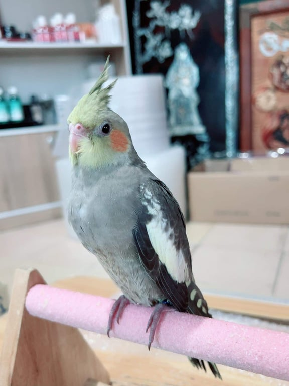 สี: หัวเหลืองแก้มแดง ตัวเทา