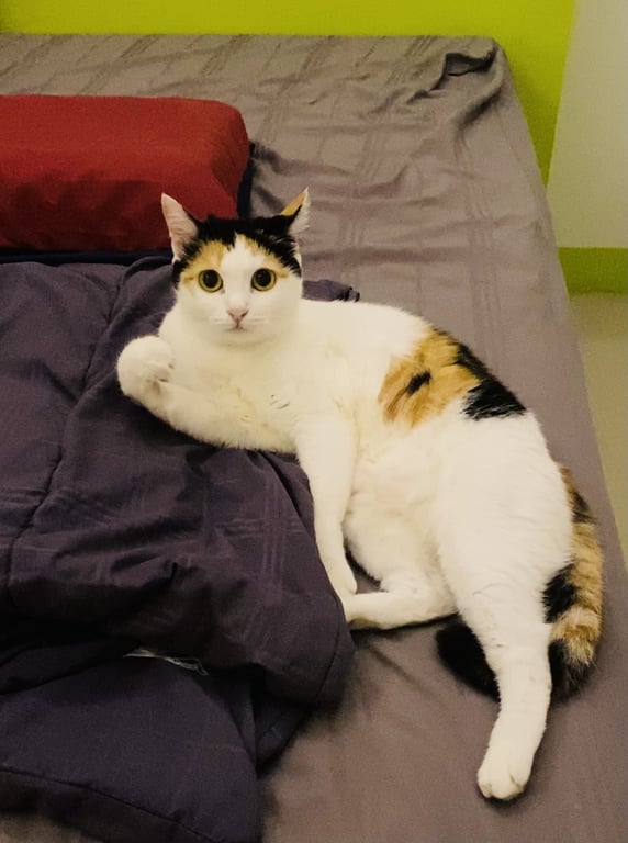 รอยตำหนิ: ตัวสีขาว มีหน้าม้าสีดำ หางสามสีน้องขี้กลัว 😭 กินยาก ชอบที่ส่วนตัวมาก ๆ ไม่ชอบเสียงดัง