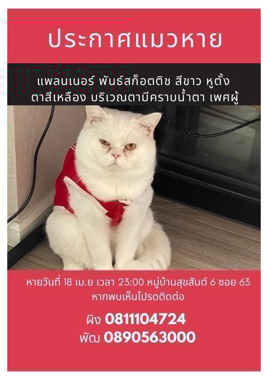 รอยตำหนิ: บริเวณตามีคราบน้ำตาจำนวนมากนิสัยใจดี ไม่เคยทำร้ายใคร ติดสัตว์