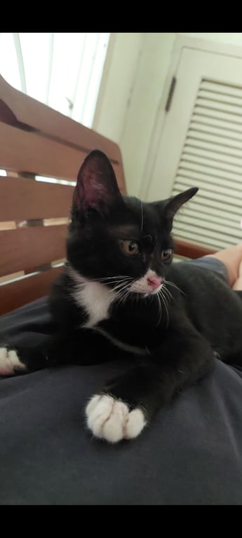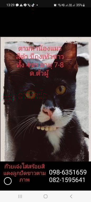 รอยตำหนิ: เท้าขาว ช่วงปากขาว จมูกออกสีชมพู ใส่สร้อยเชือกสีแดงร้อยลูกปัดขาวที่คอไม่กลัวคน ชอบอยู่กับคน