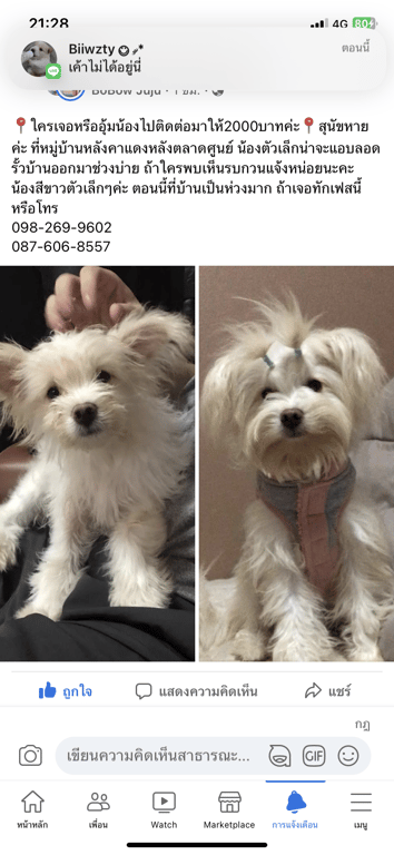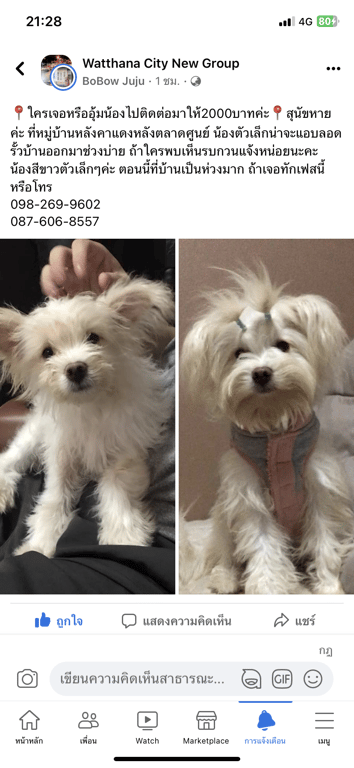 รอยตำหนิ: ตัวเล็กหนักประมาณ3กิโลน้องขี้กลัว จะวิ่งหนีคน หลุดออกไปจากรั่วบ้านตั้งแต่วันที่ 19/4/66 น้องไม่เคยออกไปนอกบ้าน หาตลอดแต่ไม่เจอ