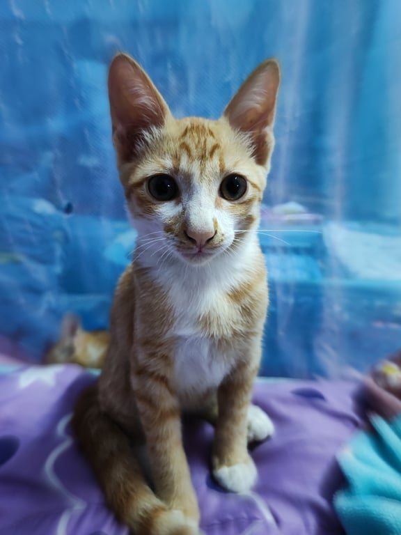สี: สีส้มขาว รอยตำหนิ: หางยาว มีปลอกคอสีน้ำเงิน ป้ายชื่อสีทอง