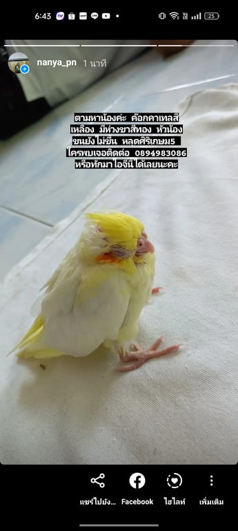 สี: สีเหลืองแก้มส้ม รอยตำหนิ: ขนที่หัวยังไม่เต็ม