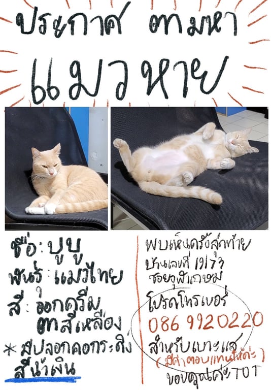 รอยตำหนิ: ตาสีเหลือง ปลอกคอสีน้ำเงินมีกระดิ่งค่อนข้างดุและไม่ชอบให้ใครแตะตัว