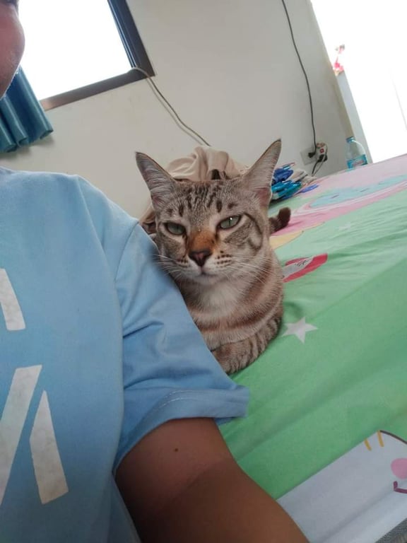 รอยตำหนิ: มีหางงอ ท้องที่ทำหมันมีก้อนกลมๆ ลายสลิดพูดเก่ง ขี้อ้อน เป็นมิตร กอดได้หอมได้ เข้ากะเด็กค่ะ