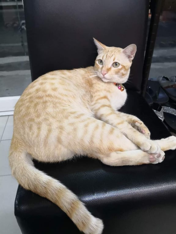 รอยตำหนิ: ไม่ได้ใส่ปลอกคอ รอบคอขนยังขึ้นไม่เสมอกันเพราะไปรักษาแผลที่คอมา อายุ1ขวบกว่าๆ ขี้กลัวไม่ยอมให้ใครจับง่ายๆ ขนคอด้านล่างสีขาว ตาสีเหลือง หนวดยาว หางยาวปลายงอนิดหน่อยจะอ้อนแค่บางคน ปกติขี้กลัวมากๆ
