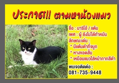 รอยตำหนิ: หางขอดสั้น หน้าเหมือนใส่หน้ากากสีดำ มีแต้มดำที่จมูกค่อนข้างเรียบร้อย ขี้กลัว ตื่นคน แต่ไม่ตื่นกับสุนัข