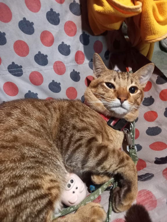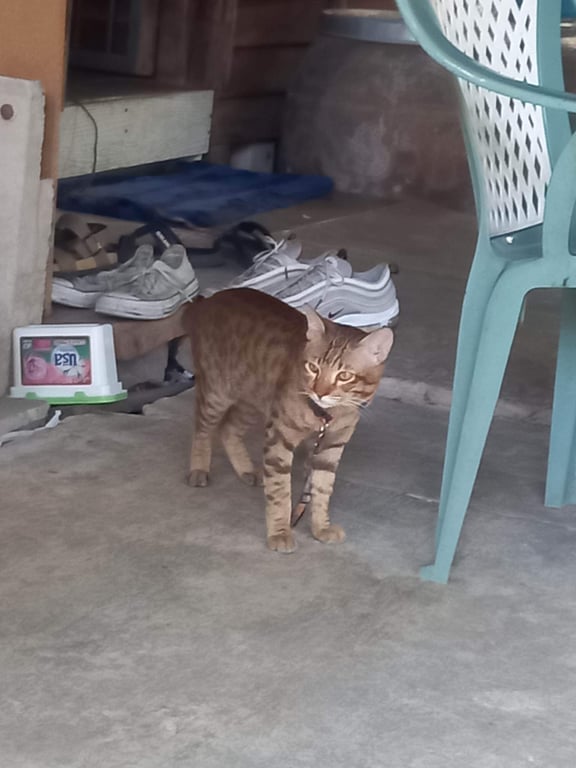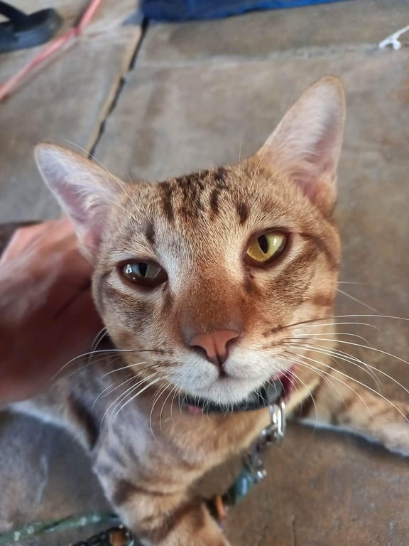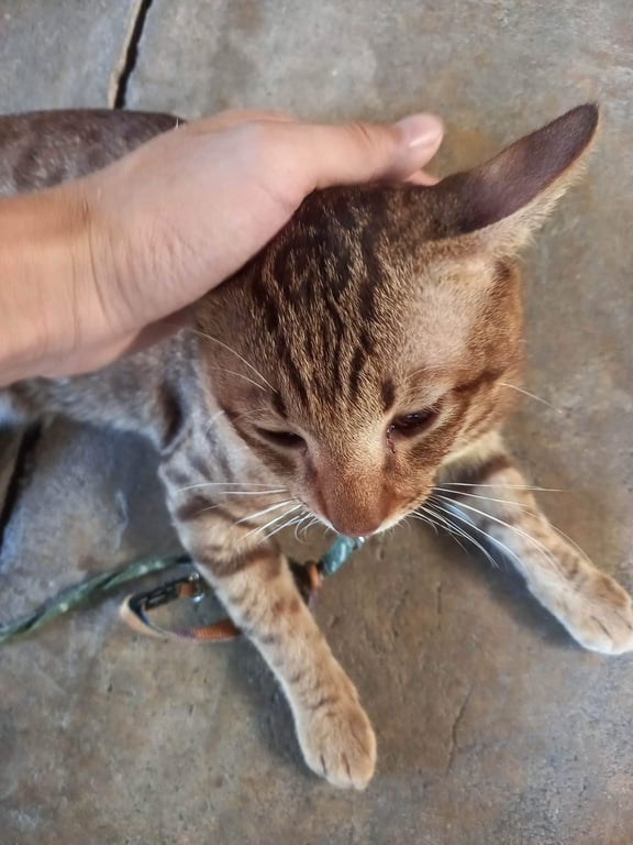 รอยตำหนิ: หางยาว ลายสลิดจุดๆ ตาเหลือง น้ำหนักเกือบ5กิโลกรัมอายุเกือบ1ปี