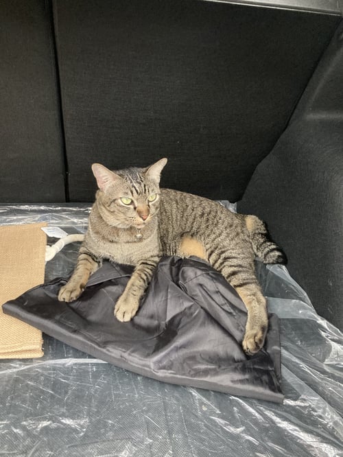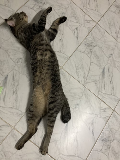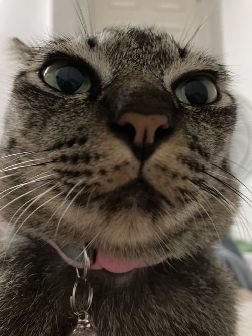รอยตำหนิ: หางสั้น และงอ น้ำหนักประมาณ 4 ก.ก ปลอกคอสีชมพู กระดิ่งสีชมพูเป็นแมวขี้กลัว ไม่ชอบคนนอก ชอบอยู่กับเจ้าของอย่างเดียว
