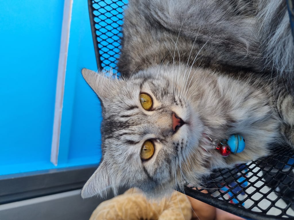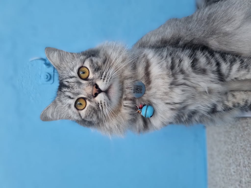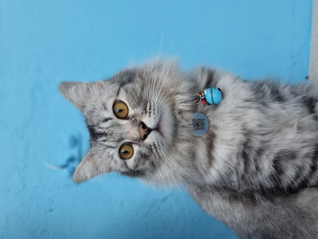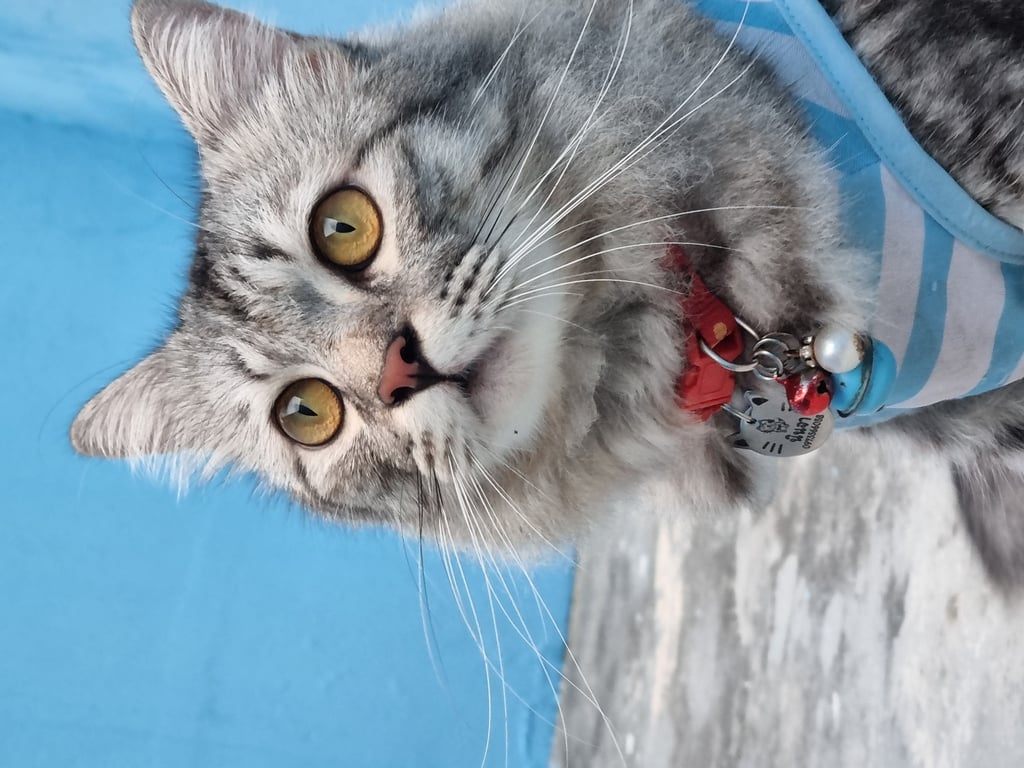 รอยตำหนิ: มีปอกคอเป็นรูปเฟรนฟราย ตัวสีเทา น้ำหนักประมาณ 5-6 กก.
