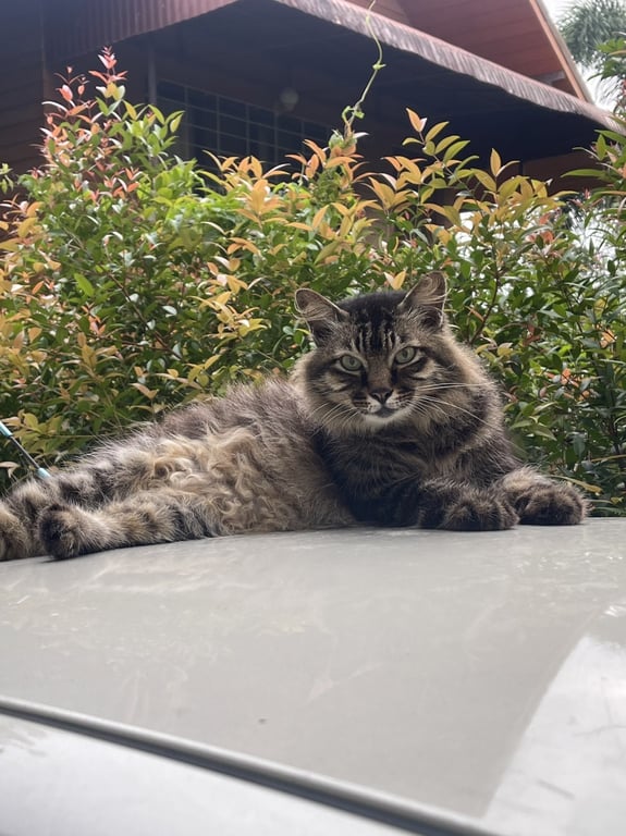 รอยตำหนิ: น้ำหนักประมาณ 3.5 kg ไม่ค่อยร้อง ขนที่หลังเรียบ แผงคอหนาขี้อ้อน ไม่ค่อยกลัวคน นอนเก่ง เชื่องช้า ไม่ค่อยกิน ชอบกินอาหารเปียก/ แมวเลีย ชอบนอนบนหลังคารถ