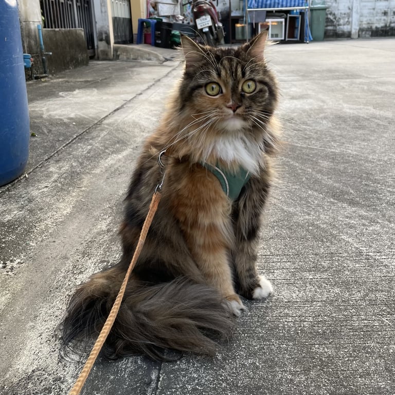 รอยตำหนิ: หน้าและแขนข้างนึงเป็นสีส้ม คางสีขาวเป็นแมวสามสี ขนยาว อายุ 2 ปี เพศเมีย ทำหมันแล้ว ขนที่แขน และหน้าครึ่งนึงเป็นสีส้ม คางสีขาว หางฟู ใส่ปลอกคอสีฟ้า พร้อมกระดิ่ง น้ำหนักประมาณ 4 kg.