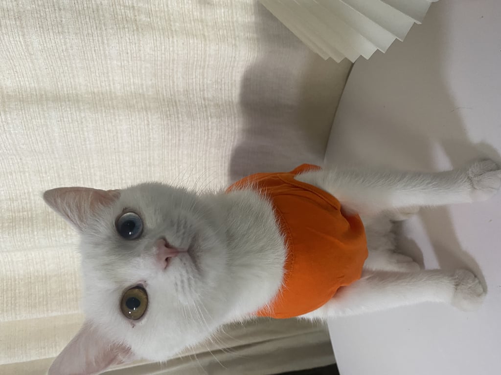 สี: ขาวปรอททั้งตัว ตาสองสี สีเหลือง-ฟ้า