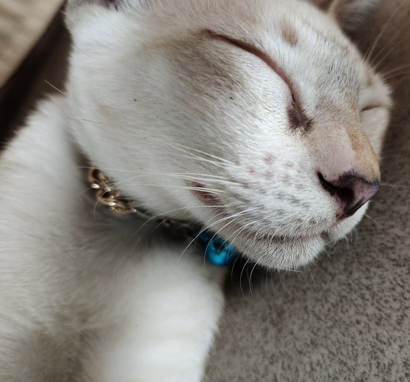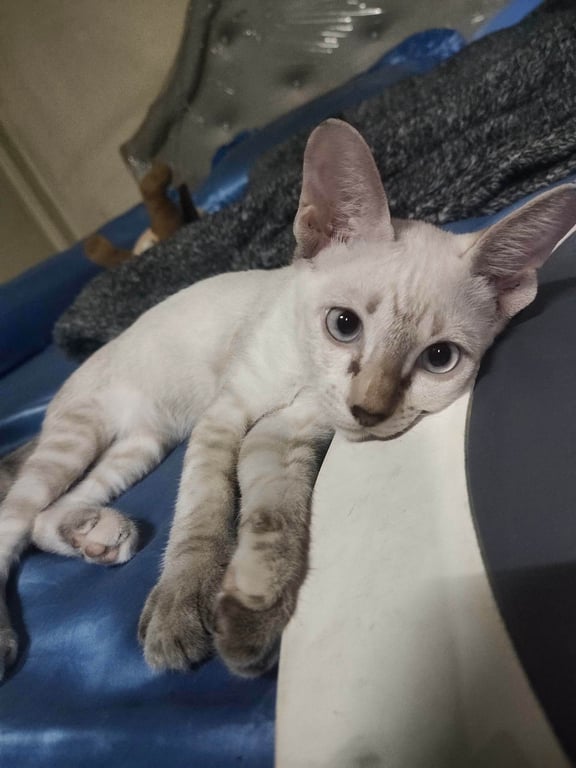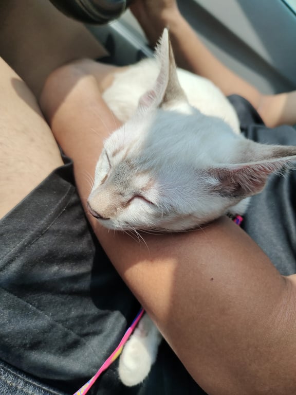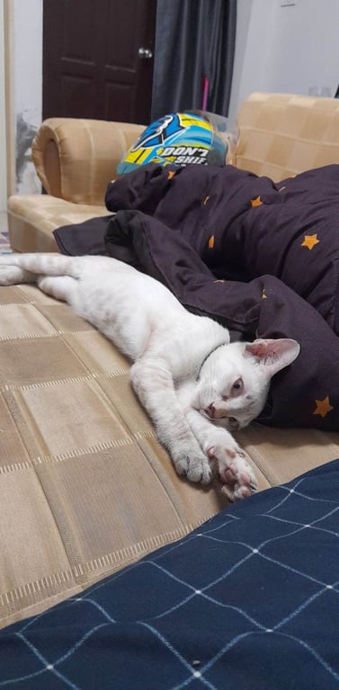 รอยตำหนิ: หางกุดสีดำ จมุกมีจุดสีดำอายุประมาณ4เดือนกว่า น้องสีขาวเทา หางกุดสีดำ จมูกสีดำมีจุดสีดำ มีปลอกคอสร้อยสีเงิน กระดิ่งสีฟ้า